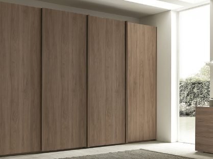 Armadio 4 ante scorrevoli con 2 a specchio disponibile in 6 finiture: tutto bianco frassino, tutto noce, tutto olmo, struttura olmo frontali bronzo, tutto spatolato e struttura bianco frassino frontali cemento.