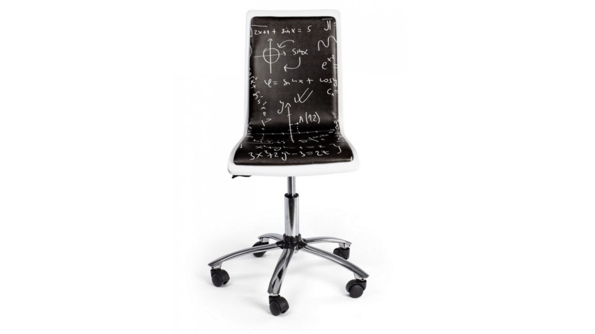Sedia base in finitura cromata diametro 60cm, 5 ruote, seduta in laminato imbottito in schiuma poliuretanica rivestita in similpelle stampata, altezza regolabile.