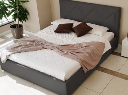 Letto contenitore matrimoniale con rete a doghe compresa, rivestimento in diversi tessuti.