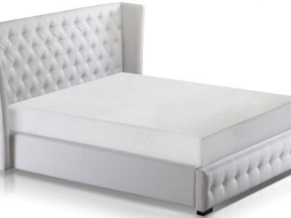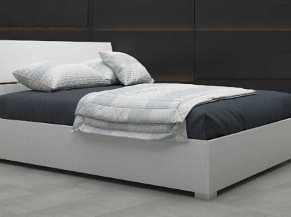 Letto contenitore matrimoniale con rete a doghe compresa, finitura laminato. Disponibile anche con cuscino in ecopelle bianca e led.