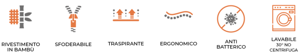 - Rivestimento: Fodera a sacco in tessuto misto cotone/poliestere con fibra di bambù.