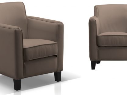 Poltrona imbottita rivestita in similpelle, linea classiche con braccioli a riccio.