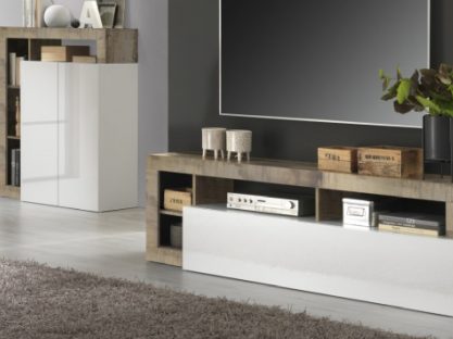 Contenitore alto 2 ante più vani a giorno in finitura bianco lucida e ossido o bianco lucida e pero.