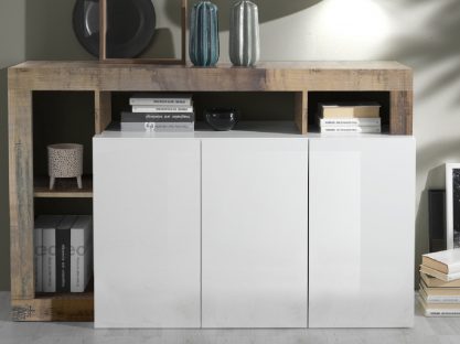 Madia 2 ante più vani a giorno in finitura bianco lucida e ossido o bianco lucida e pero.